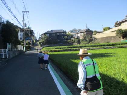 今日も見まもり隊のみなさんに見守られながら、安全に登校していました!通学路の田んぼの稲が膨らんできました!そろそろ黄色く色づいている穂もありました!