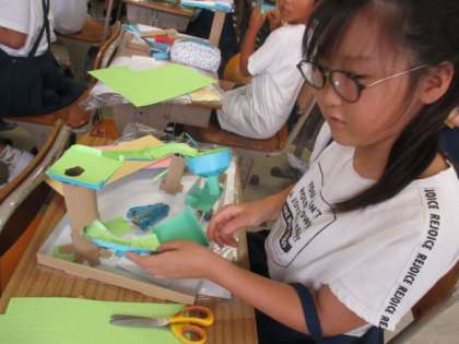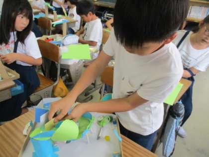 4年生 図工 「コロコロガーレ」 公開日 2023/09/13 更新日 2023/09/13 活動の様子 ビー玉の転がるルートを一生懸命つくっていました。何度も何度もビー玉を転がして、転がり方や、転がるスピードを確認して、道の角度や長さ、曲がり方などを工夫していました!