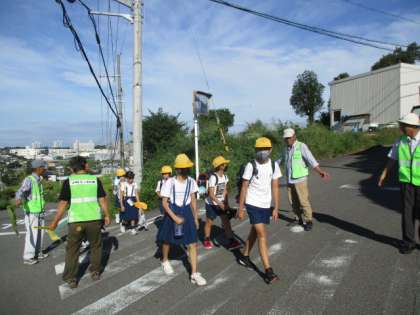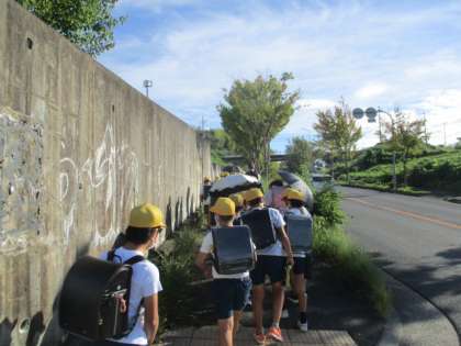 6年生リーダーを中心に集団登校中。みんな元気に登校しています。見守りたいの皆さんも、毎日見守ってくださるので安心です。