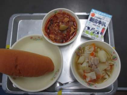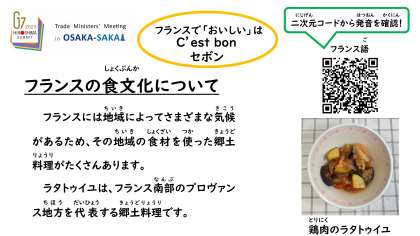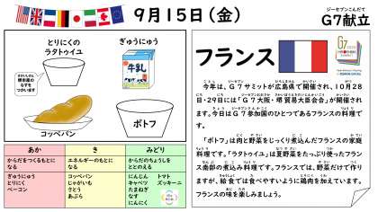 9月15日(金)の給食 公開日 2023/09/15 更新日 2023/09/15 活動の様子 今日は「G7大阪・堺貿易大臣会合」参加国のフランスにちなんだ料理がでました。 世界に触れる機会になったと思います。 おいしくいただきました。