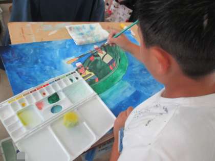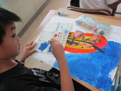 臨海学校での思い出を絵にかいています!今日は背景の「波」に取り組んでいました。細かい色の違いに気をつけて、色を塗っていました。できあがりが楽しみです!