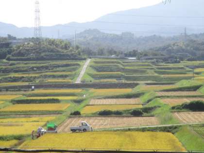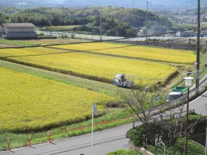学校の前の田んぼの稲刈りが本格的にはじまりました。ウインカーの音が「ピツピツピツ」とひびいています!!
