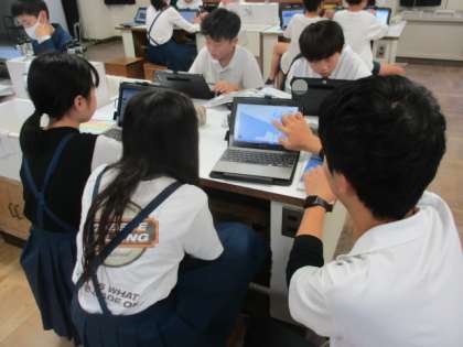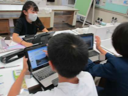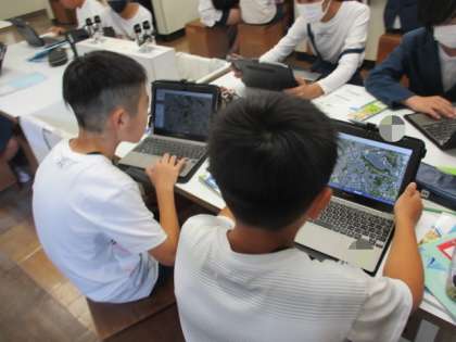 児童用パソコンで地図を検索して、実験した結果が、実際の川でも同じようなはたらきがあるのかについて考えました。曲がっている川の外側と内側の地形の違いを見比べていました!!