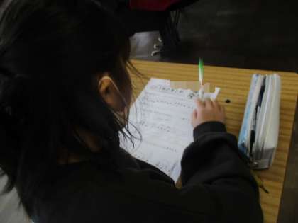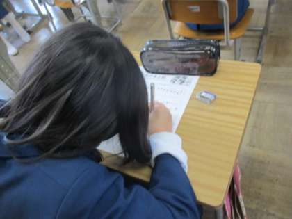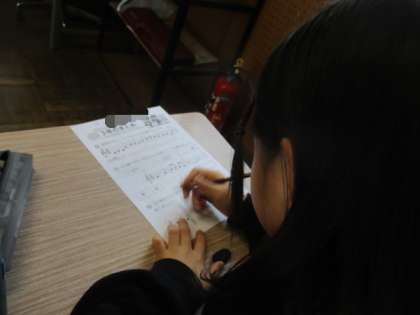 今までに学習していた、音符や記号、音階やリコーダーの指おさえについての筆記テストに挑戦していました。「ふ点四分音符」や「縦線」など、難しい言葉もしっかりと答えることができていました!!