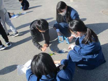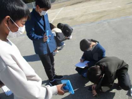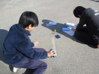 光電池での発電の実験を行いました!鏡をつかってあたる光を強くしたり、弱くしたりして、どのように変化するのか比較しました。光が強くなればなるほど、モーターが速く回っていく様子が観察できました!!
