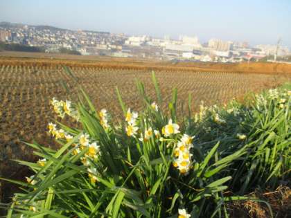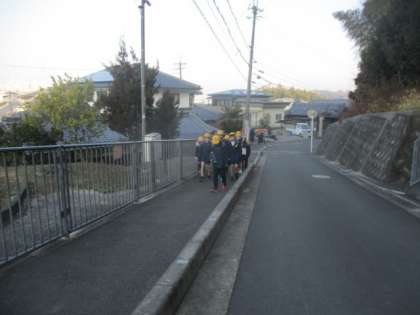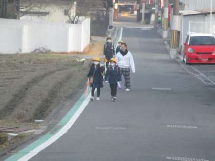 今日も元気にあいさつすることができていました!さすが上神谷っ子です!通学路のスイセンが朝日をあびてキレイに咲いていました!!