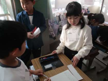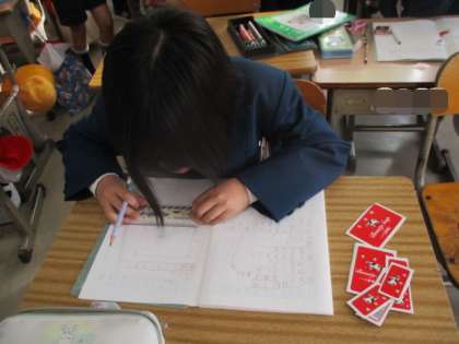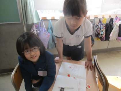 家から持ってきた「はこ」のひみつを見つけていました!!箱を面ごとに切って、友だちの箱のパーツと見比べて、気づきをノートにたくさん書いていました!!探究的に授業に取り組むことができていました!!
