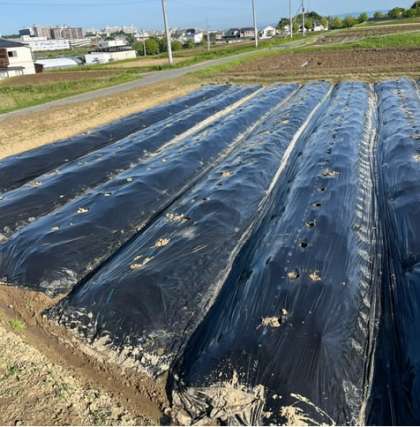 営農組合さんに、たくさん準備をしていただいています!畝には黒マルチをかけてくださっていますので、泥の影響はありません。少し水が残っているところはありますが、予定通りサツマイモの苗植えを実施します。長靴の準備をお願いします。9時30分ごろに学校を出発して、営農組合さんの下の畑にむかいます。