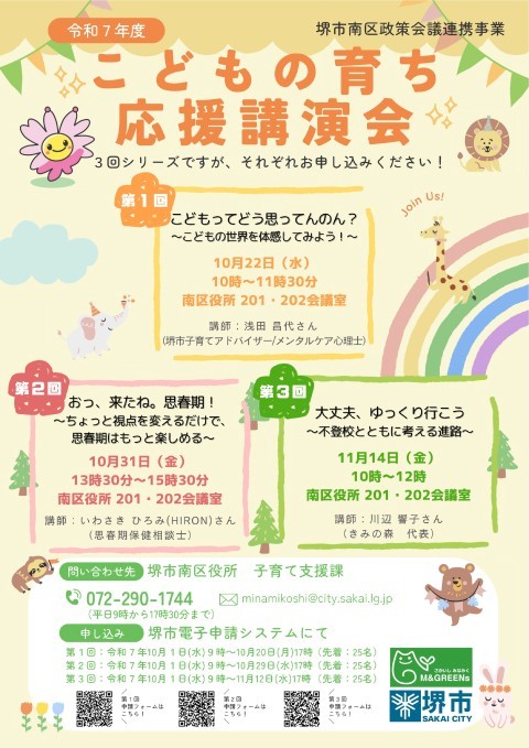南区子育て支援課より、主催事業の案内がありました。関心のある方は添付の資料をご覧いただき、資料のQRコードまたは下記のURLよりお申し込みください。 ①「こどもの育ち応援講演会」 <堺市電子申請システムURL> ・第1回:https://lgpos.task-asp.net/cu/271403/ea/residents/procedures/apply/ebf15790-b1d3-4ad8-9de5-ef55b7d28ac0/start ・第2回:https://lgpos.task-asp.net/cu/271403/ea/residents/procedures/apply/3ce86591-044d-471a-b97b-8a8eb96c9b08/start ・第3回:https://lgpos.task-asp.net/cu/271403/ea/residents/procedures/apply/f032a3e9-bcf9-4adc-bd04-99edff5dd203/start