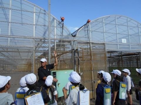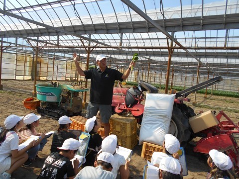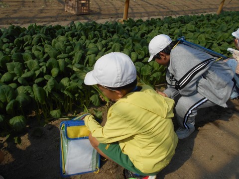 小松菜の収穫体験に行きました。海の砂を使っていることや、ハウス栽培にすることで1年に6回集荷できることなど、いろいろな工夫を教えていただき、収穫した小松菜をいただいて帰りました。