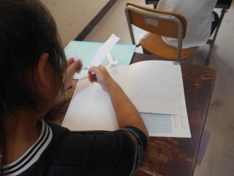 「円と球」の学習をしています。今日は,教科書の付録をつかって円の作図に挑戦しました!!押しピンに気をつけて上手に作図することができていました!!
