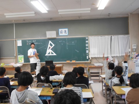 垂直な直線の引き方を考えました。三角定規を使って,離れた点と直線をつなげて垂直に交わる直線を書きます。