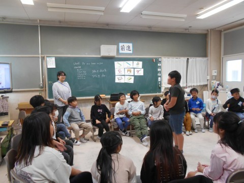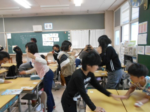文房具をあらわす言葉を学びました。単語を書いたカードを使ってかるたをしたり,フルーツバスケットをしました。