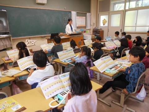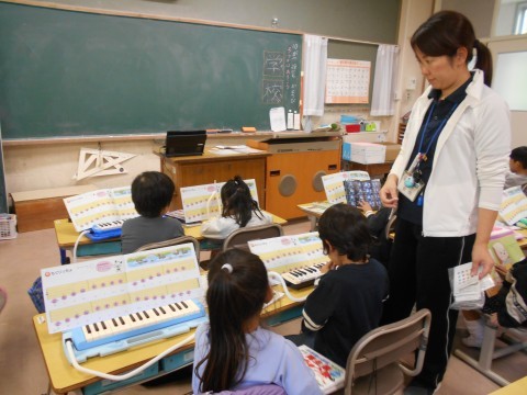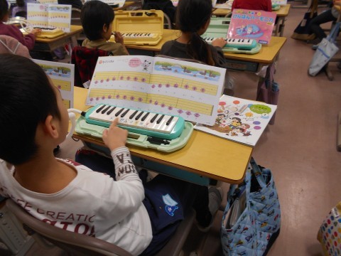 「もぐりっちょ」を鍵盤ハーモニカで演奏します。ドレミファソまで使ってゆびおくりもある曲ですが,先生にシールを貼ってもらえるようにがんばっています。