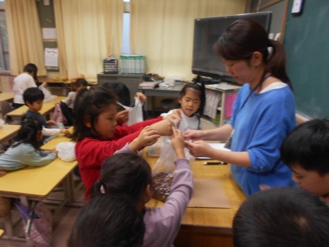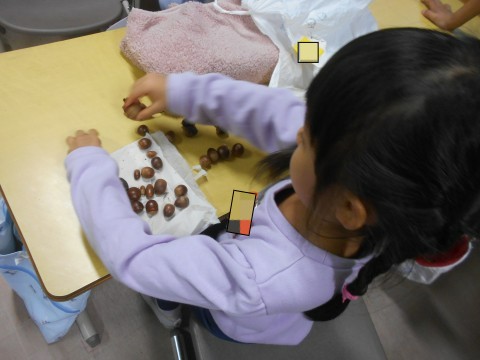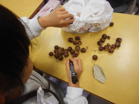 見つけた秋のものを整理していました!ドングリだけを取り出して集めてみると,とってもたくさんあることがわかりました!!穴が開いてることや,形や大きさが違うことなどに気づいていました!!