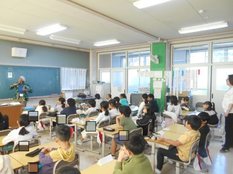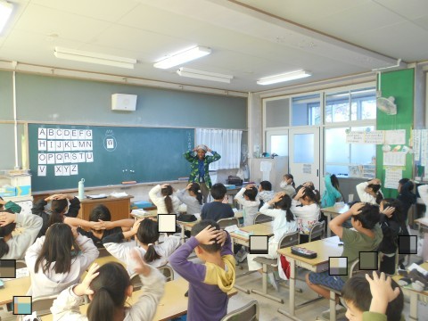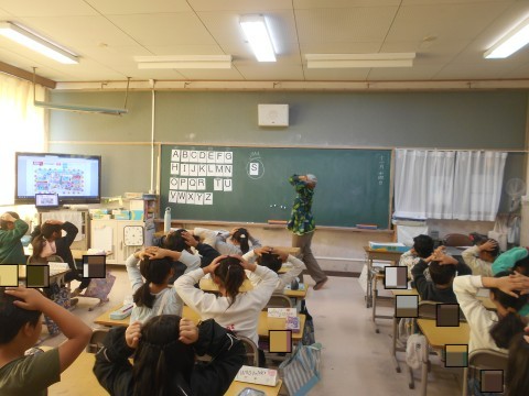 ネイティブスピーカーの先生が決めた「キーワード」が出てきたら,消しゴムをとるゲームにチャレンジしていました!先生の発音をよく聞いて,キーワードが出るのを待っていました!!