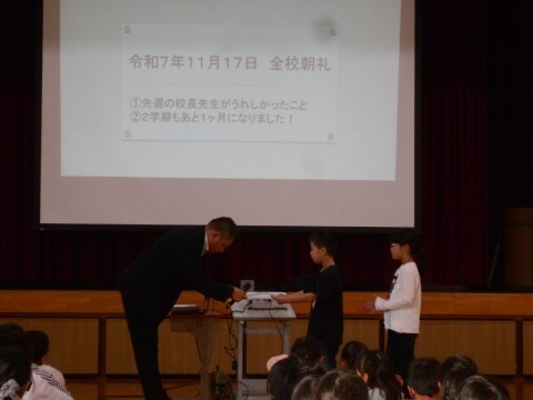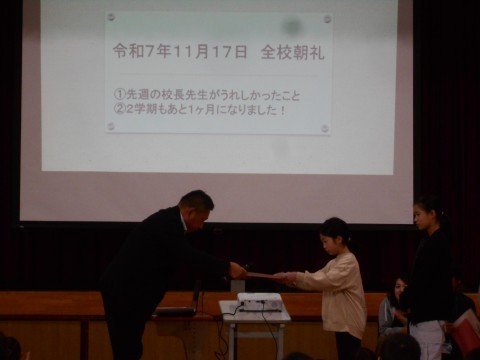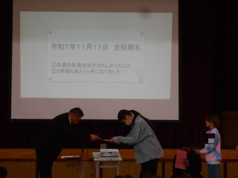 全校朝礼の様子(11月17日) 公開日 2025/11/17 更新日 2025/11/17 若松台NEWS! はとぶえコンクール・読書感想文コンクール・幼小中美術展の表彰がありました!美化委員会からは教室や廊下をきれいにするため,掃除の仕方をチェックする取り組みの告知がありました!校長先生からは,トイレのスリッパがきれいに並べられていることと,2学期もあと1ヶ月になったお話がありました! +1 若松台NEWS!