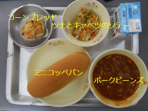 トウモロコシの粉を使って作るパンのようなもので、給食ではコーンクリームで作っています。