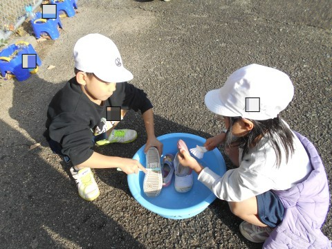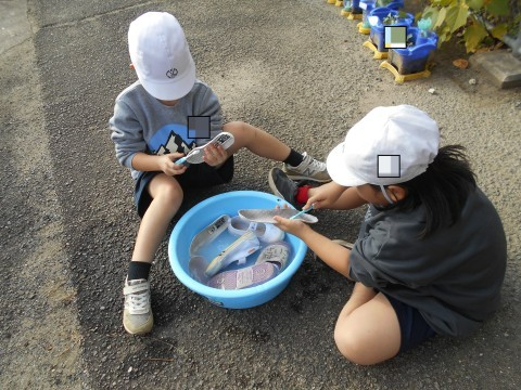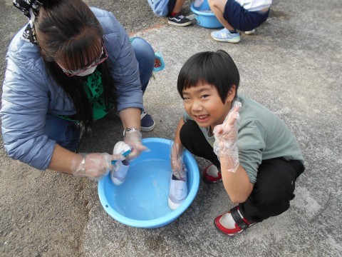 自分のうわぐつをきれいに洗いました!!とっても上手に洗うことができていました!一生懸命にゴシゴシこすっていたので,黒い水がたくさん出てきているのを見つけて,教えてくれました!!みんなよく頑張りました!!