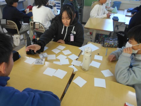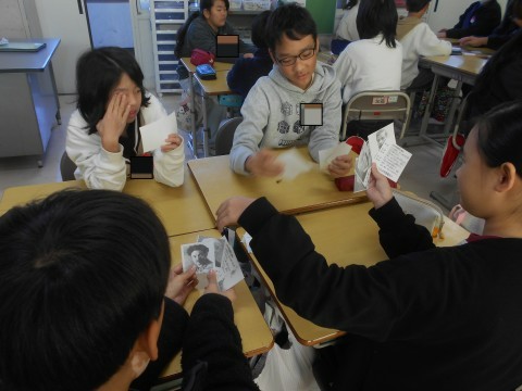 今までに学習した偉人たちの肖像画をつかって,ペアゲームやババ抜きをして楽しく学習していました!!どのグループも大いに盛りあがっていました!