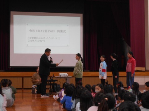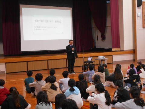 校長先生から各学年の子どもたちに「2学期に頑張っていたこと」の発表がありました!!平和ポスターの表彰もありました。生徒指導の先生と児童会のみなさんからは,冬休みの過ごし方についてのお話とクイズがありました!!83日間本当によく頑張りました!!