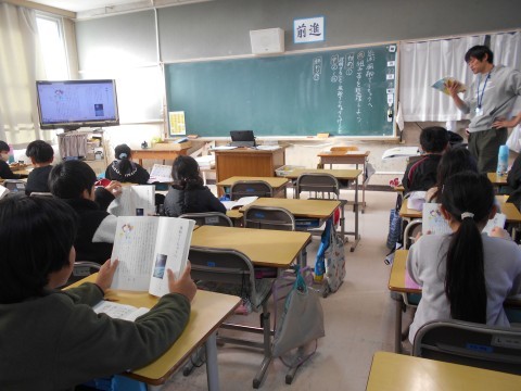 説明文の文章の組み立てを考えるために,先生と一緒に音読しました。