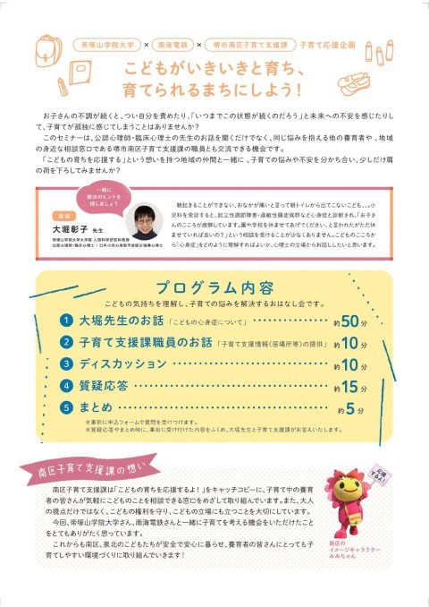 南区子育て支援課より保護者向けセミナーの案内があります。くわしくはチラシをご覧ください。