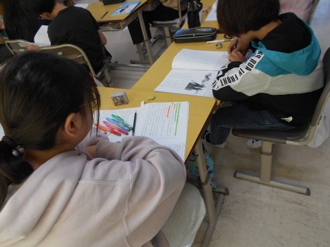 大造じいさんや残雪の心情がわかるところを考えて,しるしや色を付けていきます。二人の登場人物の気持ちを考えて物語を読み込んでいきます。