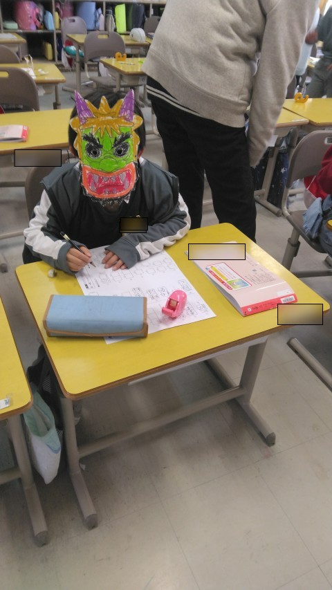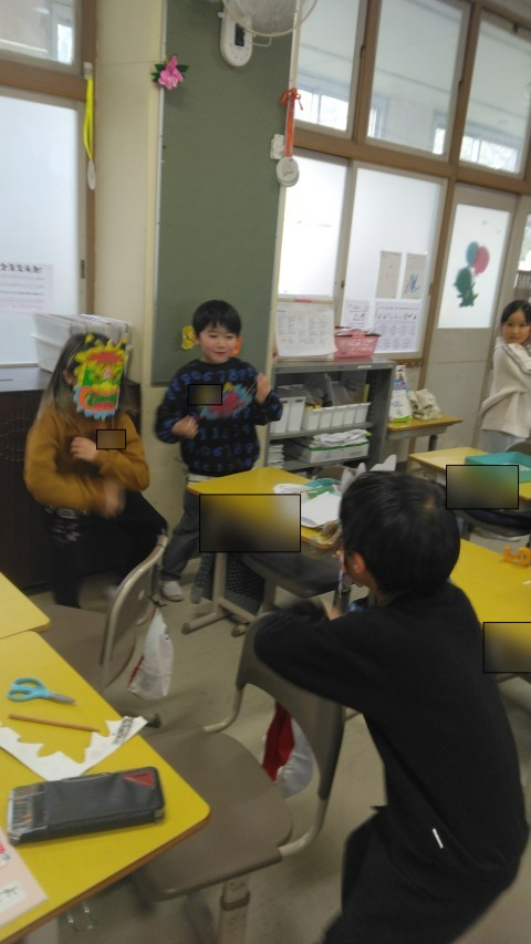 自分たちで色を塗った鬼の顔を切り取って,輪ゴムをつけてお面にしました。踊ったり,学習したり,教室はカラフルな鬼でいっぱいでした。