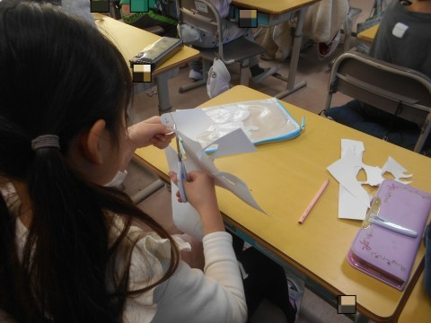 版画の台紙を切って,自分が何かに挑戦している様子を表現するようです。縄跳びやバスケットボール,凧あげなど,自分が大好きなことをイメージして構図を考えていました!!