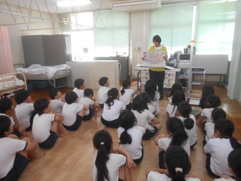 写真は4年生の保健指導の様子です。各学年の発達段階にあわせた内容を,養護教諭の先生が指導してくださっています!保健指導のあと,身長と体重を測定しました!!