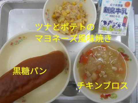 ツナとポテトの風味焼きは,ツナ・ポテト・コーンとマヨネーズの相性が抜群で,とってもおいしかったです!黒糖パンも,フワフワ・モチモチでおいしかったです!!