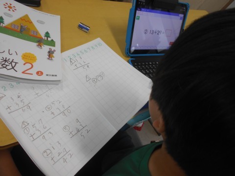 2年生 算数 「2ケタのたし算」 公開日 2026/04/27 更新日 2026/04/27 ●2年 「2ケタのたし算」に挑戦しました!筆算の計算の仕方を思い出して,繰りあがりや繰りさがりに気をつけて,どんどん問題をすすめていました。答えあわせは,児童用パソコンを活用して,自分で実施することができていました!! 2年生