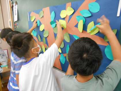 画用紙を使って,木に茂るたくさんの葉っぱを作りました。長方形の画用紙を半分に折って,葉っぱの形を切りました。向きを間違えないように慎重に作っていました。みんなの葉っぱが集まるとますます素敵になりました。
