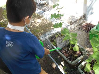 5月から育て始めた野菜がだんだん大きくなってきました。ぐんぐん大きくなる野菜に,たっぷりと水をあげました。
