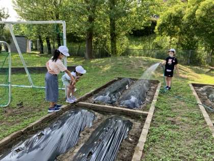今朝も子どもたちがひまわりに水をやりました。新しく撒いた種からも芽が出てきました。