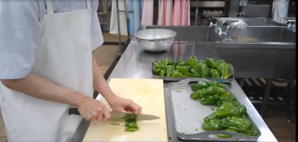今日のきんぴらピーマンは夏が旬のピーマンをたくさん使い、だし・しょうゆ・砂糖・みりん等で味付けをしました。