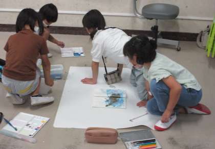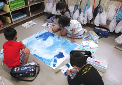 「スイミー」のお話の絵をグループで描いていました。ローラーや網も使います。