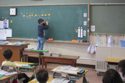 「ふえるといくつ」の学習です。算数ブロックを使って考えました。