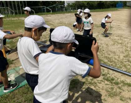 さか上がりの練習をしています。タブレットで撮影して,自分の動きを確かめています。「思ったよりも足が上がってなかった」「体が鉄棒から離れていた」など,発見があったようです。
