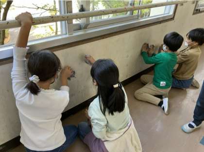 ろうか掃除の子たちが,汚れた壁をきれいにしています。