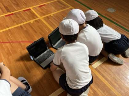とびばこの授業で,かかえこみ跳びにチャレンジしています。できるポイントを動画で確認したり,自分の跳んでいるフォームを動画で撮影したりくらべたりしながら,正しい体の動きに近づけています。