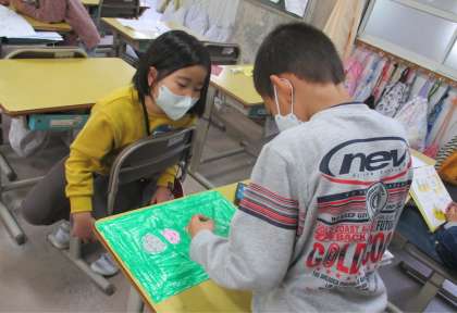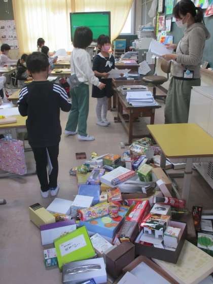 色とりどりの作品が続々と出来上がりました。家から「かたち遊び」の学習のために沢山の箱があつまりました。
