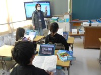 外で太陽の光を虫眼鏡で集める実験をしていました。その結果をプリントにまとめていました。