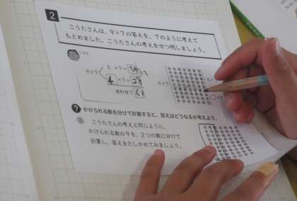 9×7の計算をどのように考えるとスムーズに計算できるかを考えています。
