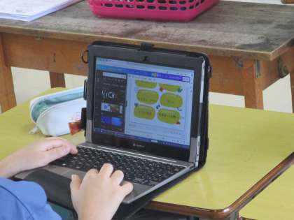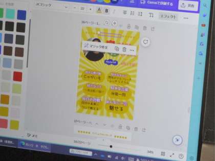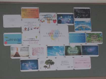 タブレットでクラスの仲間の自己紹介を見ていました。また、教室の後ろにはすてきな言葉の掲示物がありました。一人ひとりが考えたすてきな言葉です。