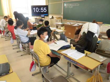 2組の算数のようすです。分数のわり算の復習をしました。担任の先生と、上神谷小学校の先生の2人に質問しながら、自分の苦手な問題を解いています。