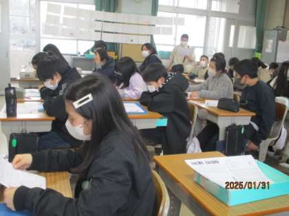 先生が学年通信を読んでくれました。卒業までの残された日数、一人一人が精一杯、学ぶことを楽しんでもらいたいです。