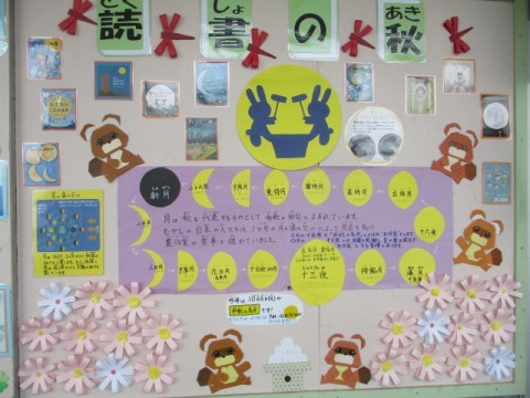 図書室前の掲示が新しくなっていました。かわいいタヌキや月で餅つきをするウサギです。月にまつわる絵本も多数紹介されています。