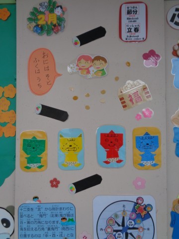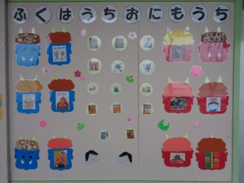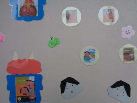 図書室前の掲示が節分のものに変わっていました。鬼の出てくる面白そうなお話の紹介もあります。